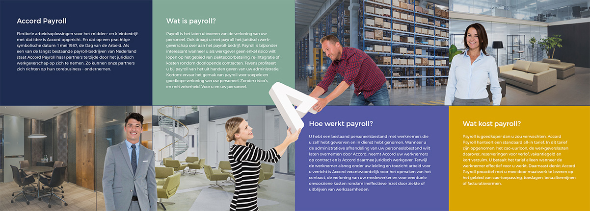 De vraag van Accord was een perfect project om alle aanwezige disciplines binnen Bengelmedia op toe te passen. We zijn gestart met het neerzetten van het communicatieconcept. Dat begint met een positionering: hoe gaat Accord zich presenteren? Door een brainstorm met het team van Accord hebben we het bedrijf leren kennen en konden we een visie, missie en passende kernwaarden opstellen: ‘partner, focus op het team, commitment, gedeeld belang en familie’. Deze kernwaarden vormen de filosofie van Accord, een familiebedrijf dat een langdurig partnerschap aan gaat met zijn klanten. De waarden waren ook geheel in lijn met de hoofdboodschap uit de huisstijl: ‘Accord: Partners in Personeel’.