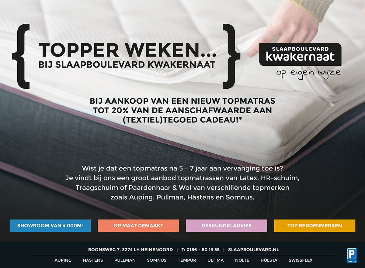 Slaapboulevard Kwakernaat wilde ook een grotere naamsbekendheid en meer publiek op de website en in de winkel. Bengelmedia heeft een marketingplan opgesteld bestaande uit een mix van online en offline media. Daarbij hebben we ingezet op goede geografische en demografische targetting en een hoge contactfrequentie. Slaapboulevard Kwakernaat is in de regio Rotterdam zeer goed zichtbaar in de regionale kranten, outdoor media en op RTV Rijnmond. Online verzorgt Bengelmedia het hele jaar rond Facebook, display en Google Ads campagnes. Doordat we inmiddels al meerdere jaren samenwerken kunnen de leerpunten van alle campagnes gebruikt worden om nieuwe campagnes nog succesvoller te maken.
