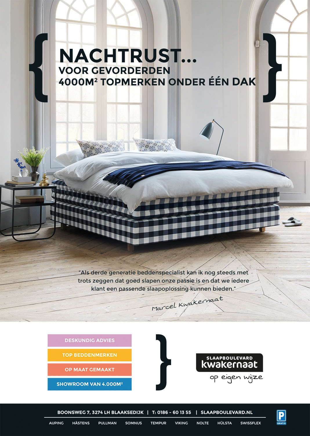Een mooie opdracht waar Bengelmedia goed de fullservice benadering op toe kon passen. Na een brainstormsessie met de familie Kwakernaat zijn we aan de slag gegaan. Om het onderscheidend vermogen te communiceren hebben we niet de nadruk gelegd op wat er in de zaak staat, maar vooral wie er in de zaak staan. Wat Slaapboulevard Kwakernaat levert is voor iedereen duidelijk. Het onderscheidend vermogen zit vooral in de mensen in de winkel. Het team van Slaapboulevard Kwakernaat heeft duidelijk een eigen stijl; oprecht geïnteresseerd, transparant, onafhankelijk en behoorlijk eigenwijs! En daar hechten de klanten van Slaapboulevard Kwakernaat veel waarde aan. Het is zakendoen op de Slaapboulevard Kwakernaat manier. De positionering werd daarom: ‘Slaapboulevard Kwakernaat – Op eigen wijze’.